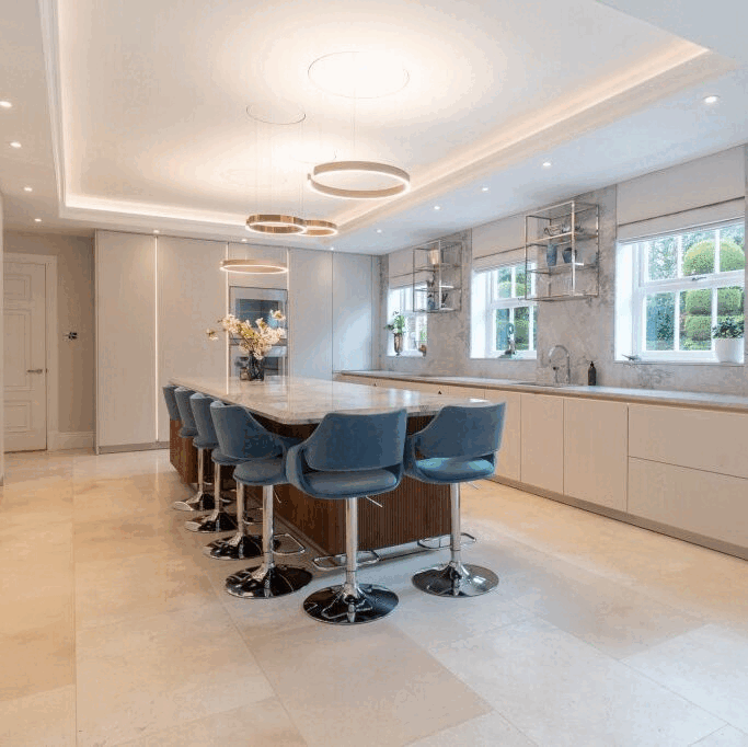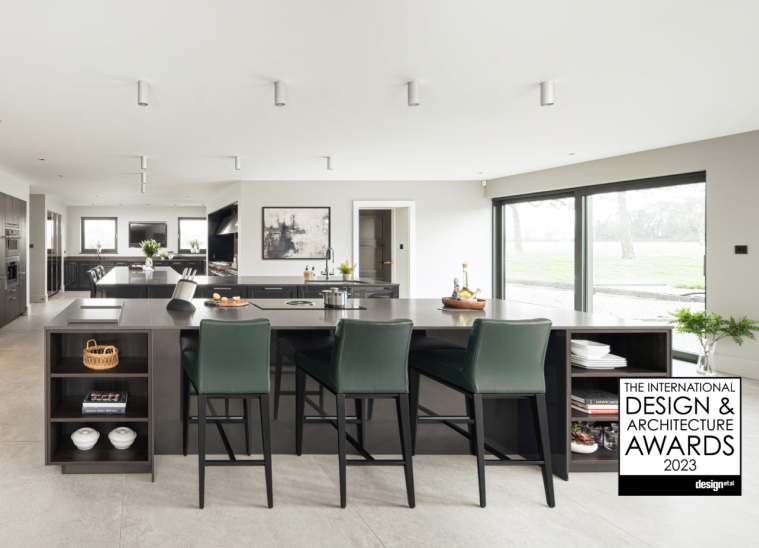 Glamour and scale are the two things that strike you upon entering this immaculate culinary space. To make best use of the space, designers have configured it into clearly defined zones that flow from one to the next. There’s a cooking area, a utility space, two immense islands, a lounge area and a dining room, all with their own sense of intimacy and conviviality.